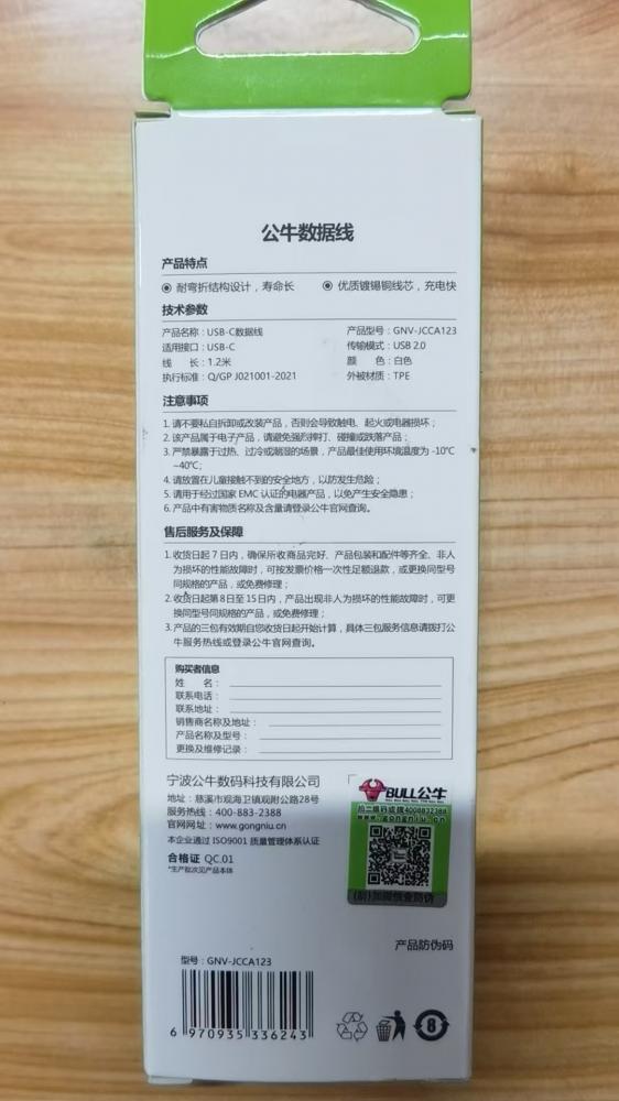 公牛速充数据线 3A 1.2米 双usb-c口数据线 充电快耐折弯