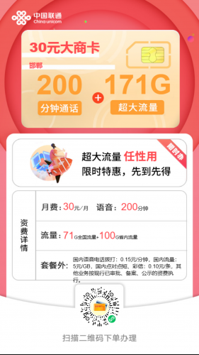 电话卡流量卡30元大商卡 200分钟共171G流量