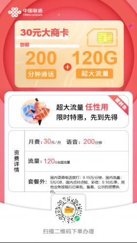 电话卡流量卡30元大商卡 200分钟共171G流量
